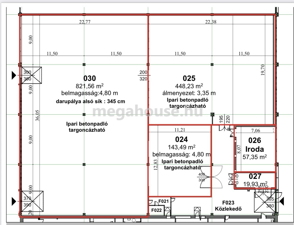 belmagasság 4,8 m, darupálya alsó síkja: 3,45 m, 2 db ipari kapu (3,8 m x 3,8 m)