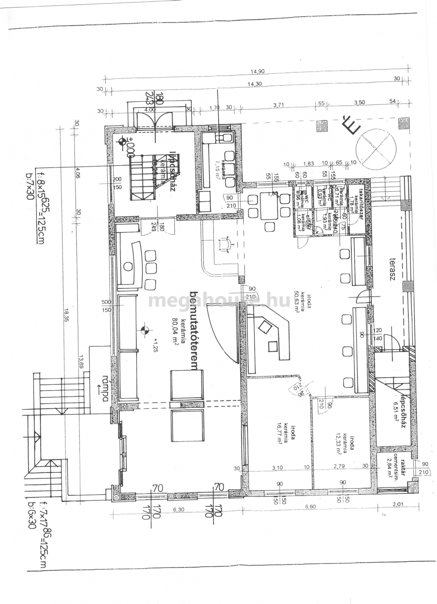 A földszinti bemutatóterem (182 nm+ 14 nm fedett terasz ) tágas, világos, fotocellás dupla ajtóval, exkluzív olasz kőlapokkal van burkolva. Vezetői szoba, tárgyaló, pultok, személyzeti konyha, női-férfi mosdók találhatók itt. Nagy terek, áttekinthetőség. Plusz kijárat a hátsó raktár és a felső iroda felé.